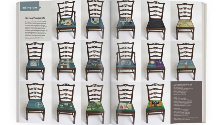 Every past president of the College has his own seat cushion on a chair in the current president’s dining room, a custom that began in the late 1950s. A unique design and set of symbols in needlework represent the accomplishments of each administration. For more information on each chair, visit dartgo.org/seats.