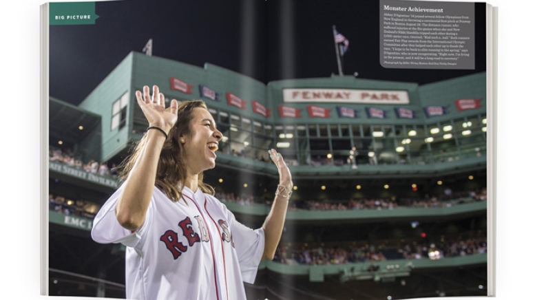 Abbey D’Agostino ’14 joined several fellow Olympians from New England in throwing a ceremonial first pitch at Fenway Park in Boston August 28. The distance runner, who