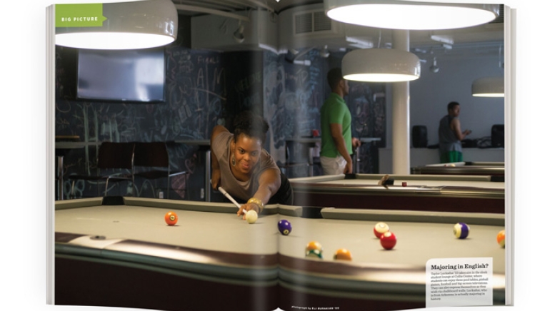 Taylor Luckadue ’15 takes aim in the sleek student lounge at Collis Center, where students can enjoy three pool tables, pinball games, foosball and big-screen televisions. They can also express themselves as they wish via chalkboard walls. Luckadue, who is from Arkansas, is actually majoring in history.