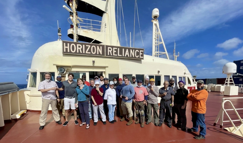 Safely onboard the Horizon Reliance, the pilots posed with Capt. Mark Tuck (far left) and his crew.