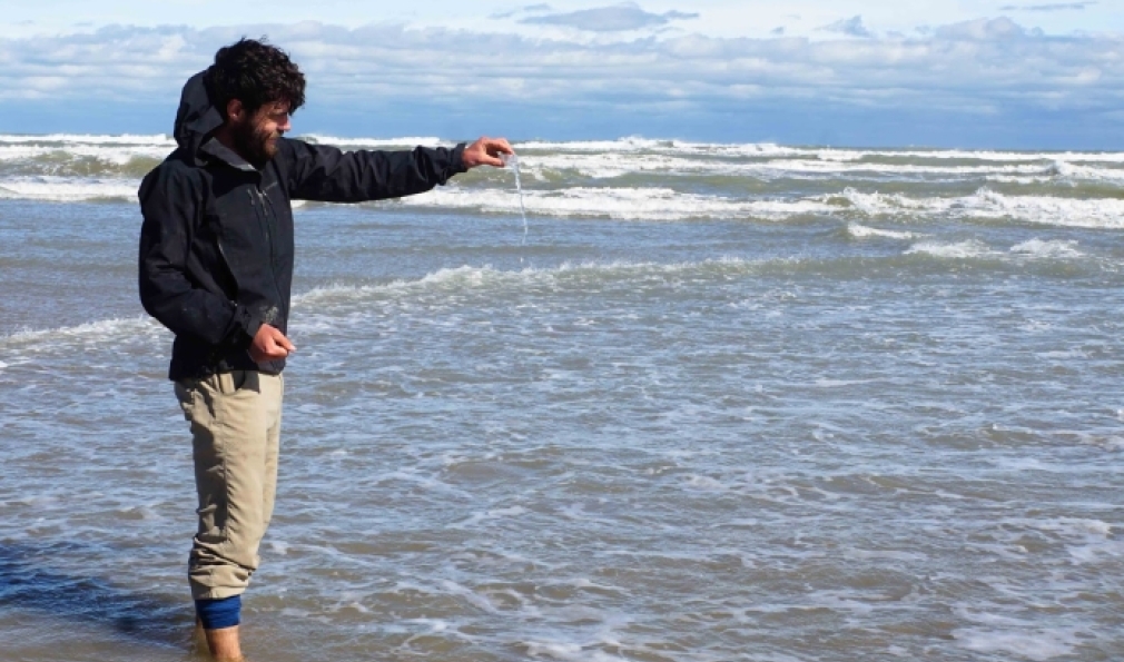 McDonald dumps the melted snow he collected seven months earlier from the headwaters of the Rio Grande into the Gulf of Mexico. (Courtesy Dan Reicher/Disappearing Rio Grande Expedition)