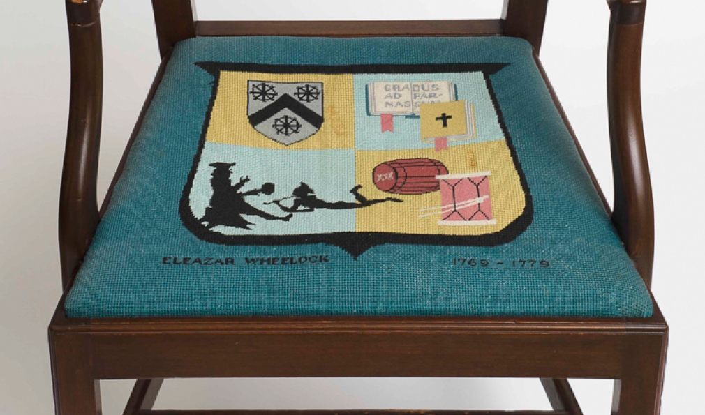 The College founder’s seat cushion features the Wheelock coat of arms (three Catherine wheels), a bible, drum and a scene of Wheelock Eleazar with a Native American.