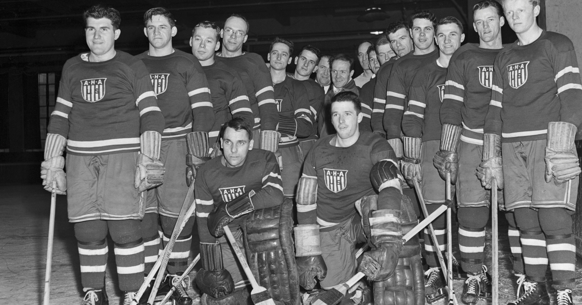 Five alums skated for the U. S. hockey team, which settled for a fourth-place finish at the outdoor rink in St. Moritz, Switzerland: Stanton Priddy ’43, Tu’44 (wearing glasses), Bruce Mather ’47 (to right of Priddy), Bruce Cunliffe ’47 (standing, sixth from right), Ralph Warburton ’47, Tu’48 (third from right), and Jack Riley ’44 (second from right).