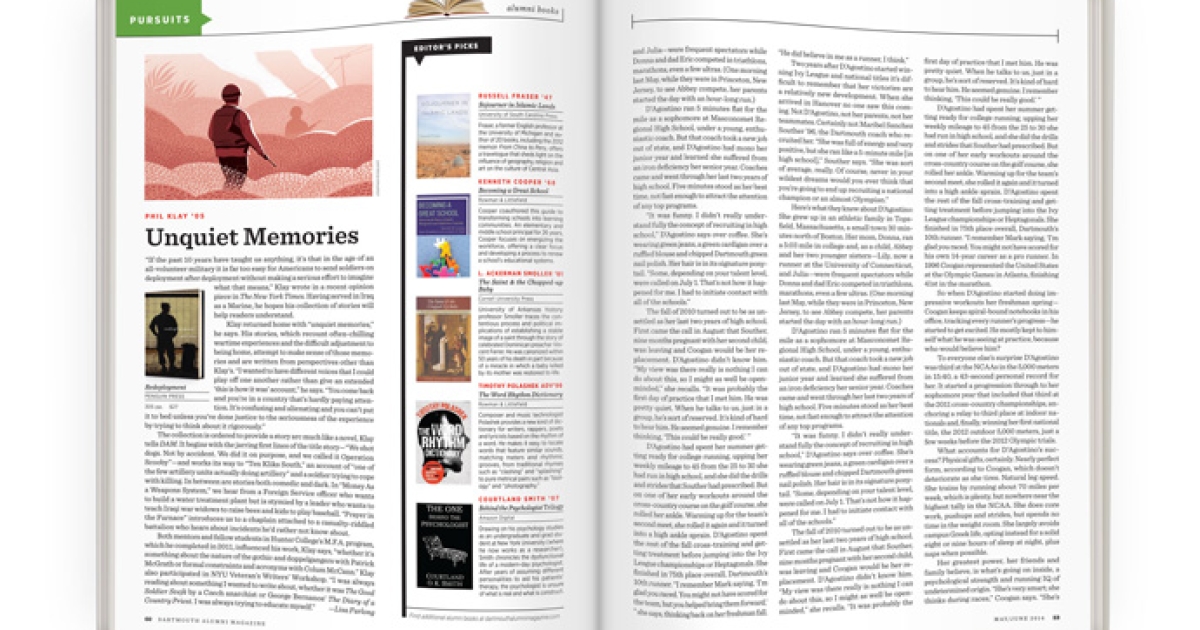 Klay returned home with “unquiet memories,” he says. His stories, which recount often-chilling wartime experiences and the difficult adjustment to being home, attempt to make sense of those memories and are written from perspectives other than Klay’s. “I wanted to have different voices that I could play off one another rather than give an extended ‘this is how it was’ account,” he says. “You come back and you’re in a country that’s hardly paying attention. It’s confusing and alienating and you can’t put it to bed unless you’ve done justice to the seriousness of the experience by trying to think about it rigorously.”