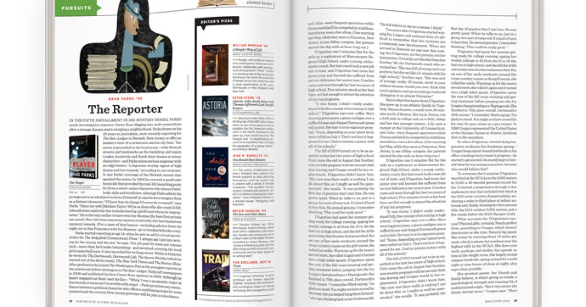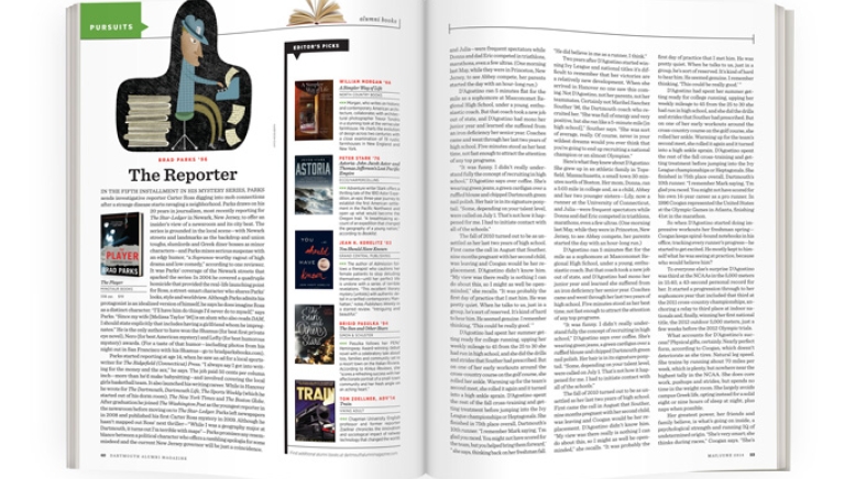 Parks started reporting at age 14, when he saw an ad for a local sportswriter for The Ridgefield (Connecticut) Press. “I always say I got into writing for the money and the sex,” he says. The job paid 50 cents per column inch—more than he’d make babysitting—and involved covering the local girls basketball team. It also launched his writing career. While in Hanover he wrote for The Dartmouth, Dartmouth Life, The Sports Weekly (which he started out of his dorm room), The New York Times and The Boston Globe. After graduation he joined The Washington Post as the youngest reporter in the newsroom before moving on to The Star-Ledger. Parks left newspapers in 2008 and published his first Carter Ross mystery in 2009. Although he hasn’t mapped out Ross’ next thriller—“While I was a geography major at Dartmouth, it turns out I’m terrible with maps”—Parks promises any resemblance between a political character who offers a rambling apologia for some misdeed and the current New Jersey governor will be just a coincidence.