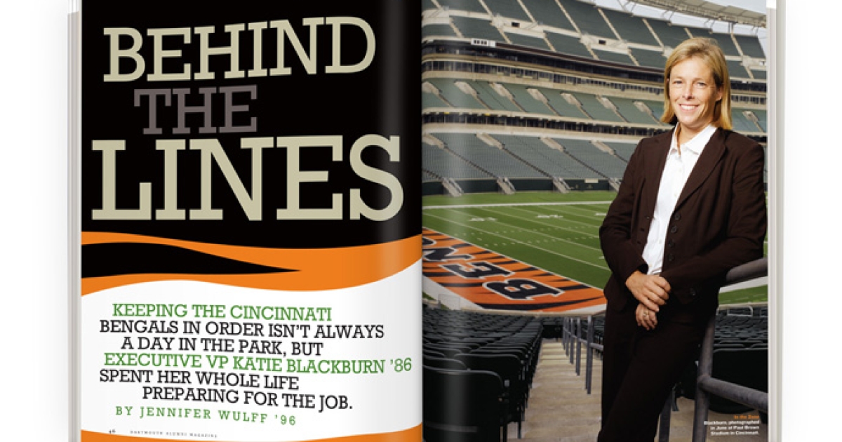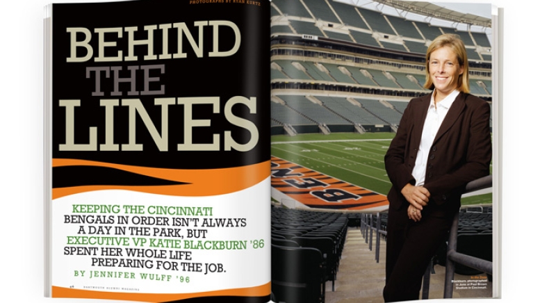 As the granddaughter of the team’s founder, Katie (Brown) Blackburn was a loyal Cincinnati Bengals fan from an early age, tagging along with her dad to games and cheering from the sidelines—in rain or shine or even extreme cold. “I remember bringing her to the stadium for what became known as the Freezer Bowl,” says her father, Mike Brown ’57, the team’s then assistant general manager under his own dad, Bengals founder and NFL legend Paul Brown. “The temperature was something like 40 below zero and she was out there before the game [the 1981 AFC championship] like it was 70 degrees out, hanging all these banners she had made from our bedsheets. She didn’t quit until they were all up.”