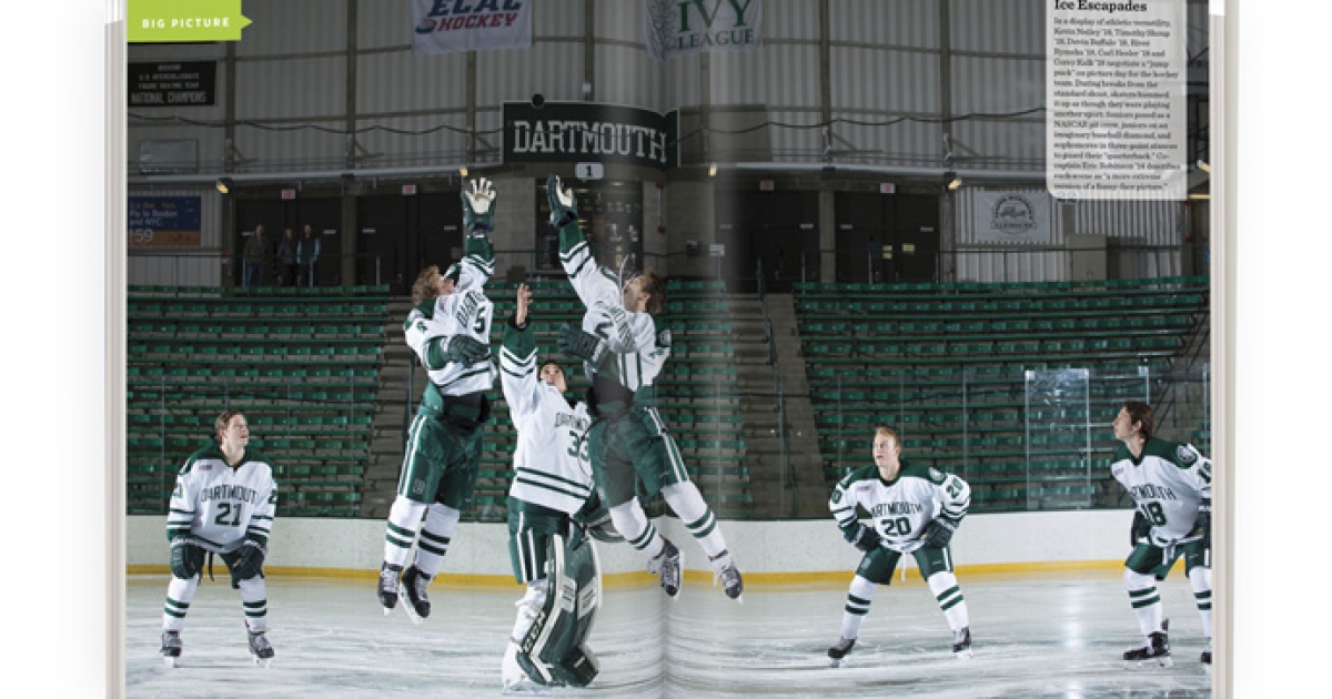 In a display of athletic versatility, Kevin Neiley ’18, Timothy Shoup’18, Devin Buffalo ’18, River Rymsha ’18, Carl Hesler ’18 and Corey Kalk ’18 negotiate a “jump puck” on picture day for the hockey team. During breaks from the standard shoot, skaters hammed it up as though they were playing another sport: Seniors posed as a NASCAR pit crew, juniors on an imaginary baseball diamond, and sophomores in three-point stances to guard their “quarterback.” Cocaptain Eric Robinson ’14 describes each scene as “a more extreme version of a funny-face picture.”