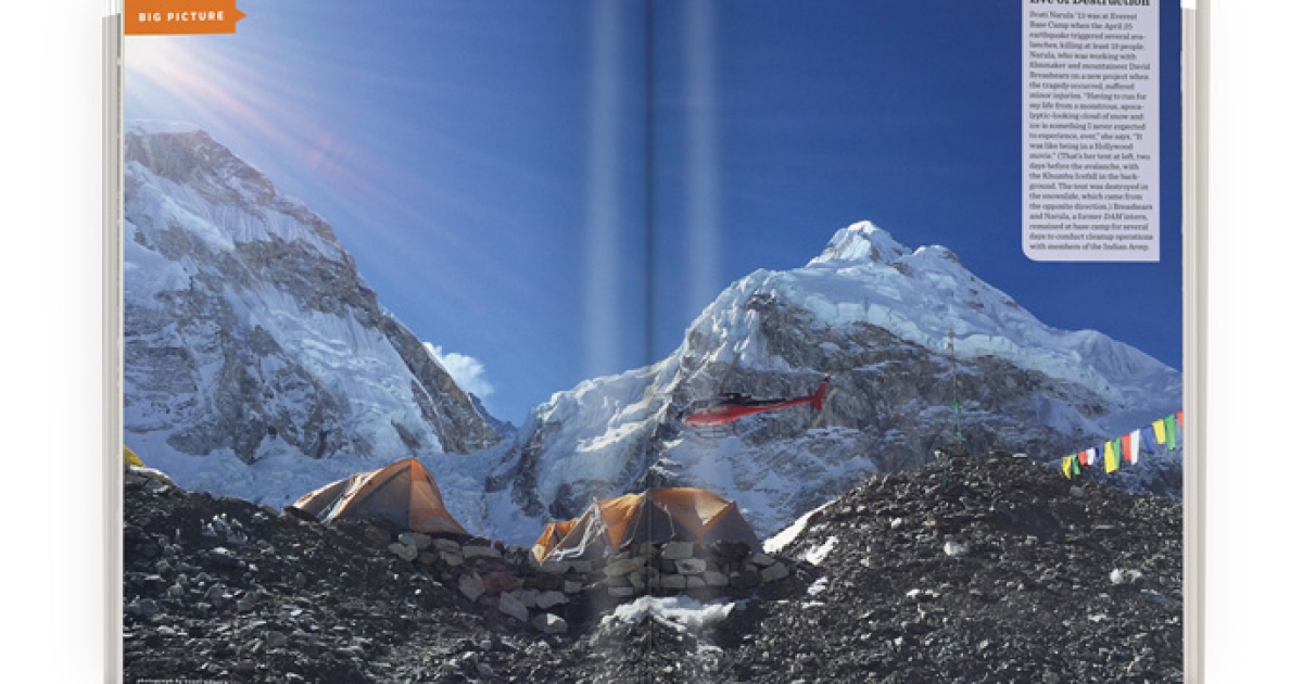 Svati Narula ’13 was at Everest Base Camp when the April 25 earthquake triggered several avalanches, killing at least 19 people. Narula, who was working with filmmaker and mountaineer David Breashears on a new project when the tragedy occurred, suffered minor injuries. “Having to run for my life from a monstrous, apocalyptic-looking cloud of snow and ice is something I never expected to experience, ever,” she says. “It was like being in a Hollywood movie.” (That’s her tent at left, two days before the avalanche, with the Khumbu Icefall in the background. The tent was destroyed in the snowslide, which came from the opposite direction.) Breashears and Narula, a former DAM intern, remained at base camp for several days to conduct cleanup operations with members of the Indian Army.