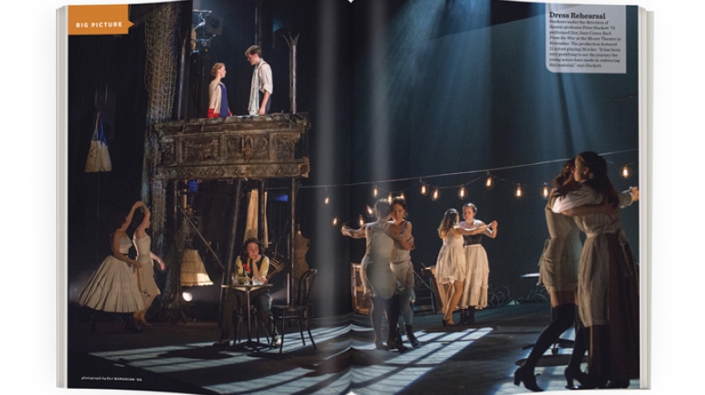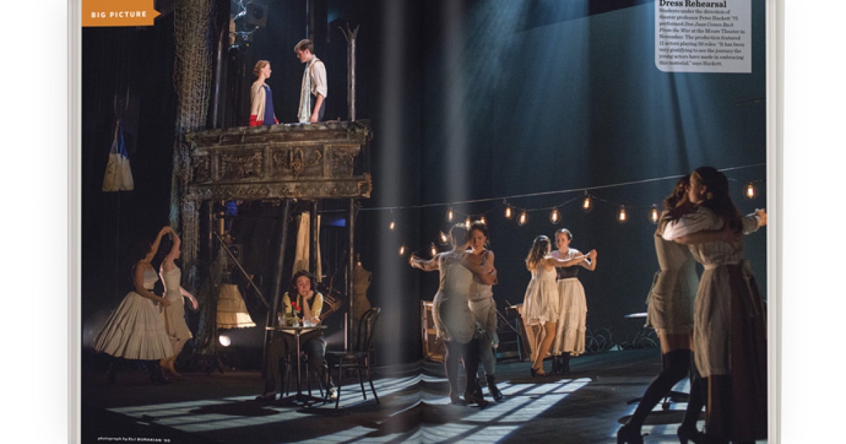 Students under the direction of theater professor Peter Hackett ’75 performed Don Juan Comes Back From the War at the Moore Theater in November. The production featured 11 actors playing 39 roles. “It has been very gratifying to see the journey the young actors have made in embracing this material,” says Hackett.