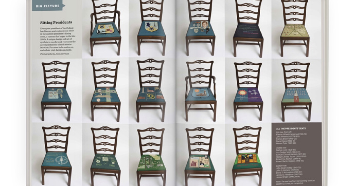 Every past president of the College has his own seat cushion on a chair in the current president’s dining room, a custom that began in the late 1950s. A unique design and set of symbols in needlework represent the accomplishments of each administration. For more information on each chair, visit dartgo.org/seats.