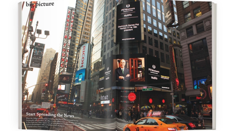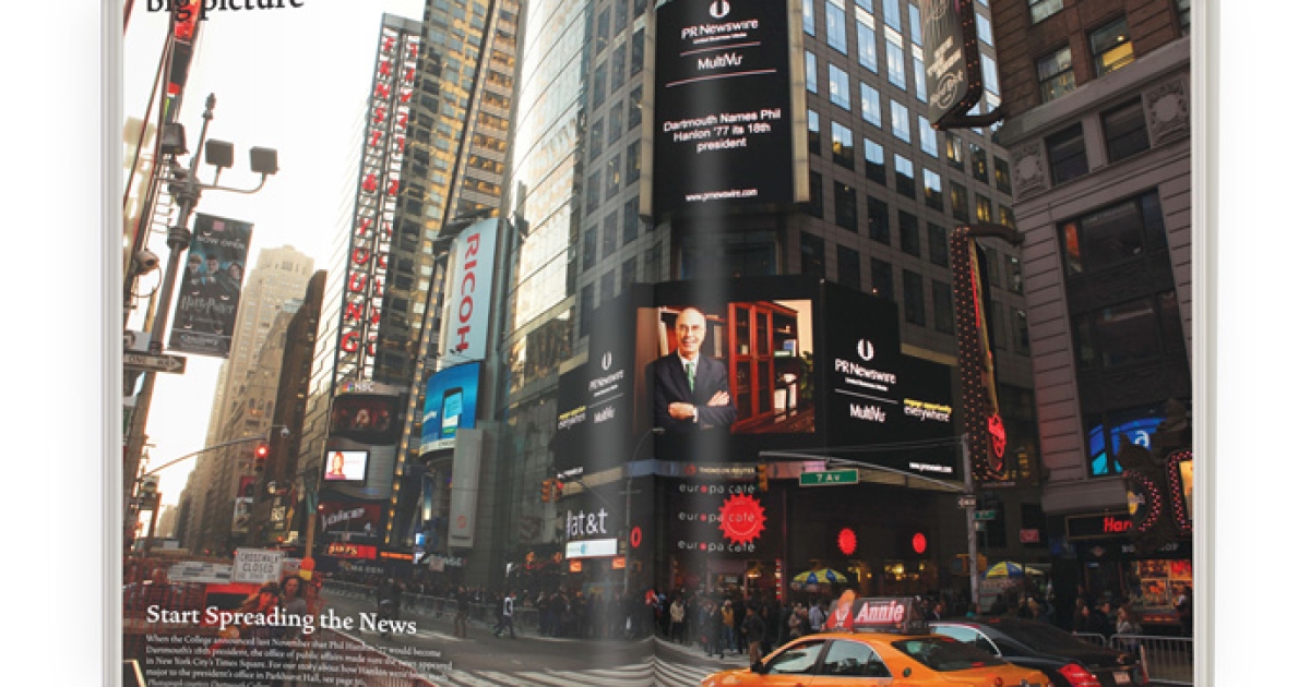 When the College announced last November that Phil Hanlon ’77 would become Dartmouth’s 18th president, the office of public affairs made sure the news appeared in New York City’s Times Square. Click here for our story about how Hanlon went from math major to the president’s office in Parkhurst Hall.