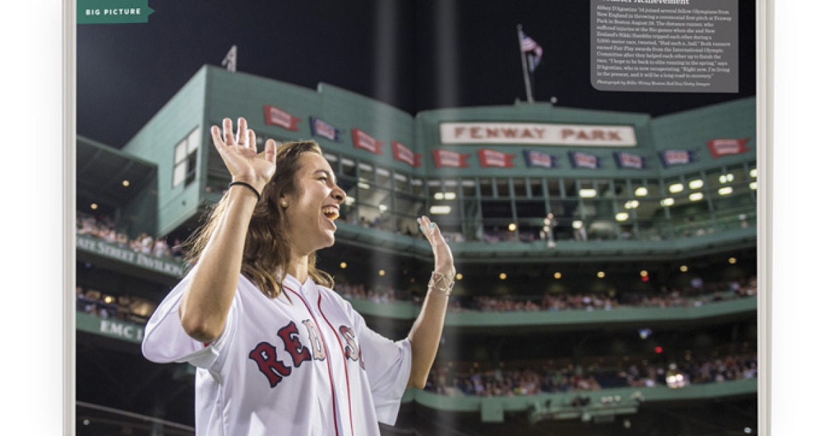 Abbey D’Agostino ’14 joined several fellow Olympians from New England in throwing a ceremonial first pitch at Fenway Park in Boston August 28. The distance runner, who