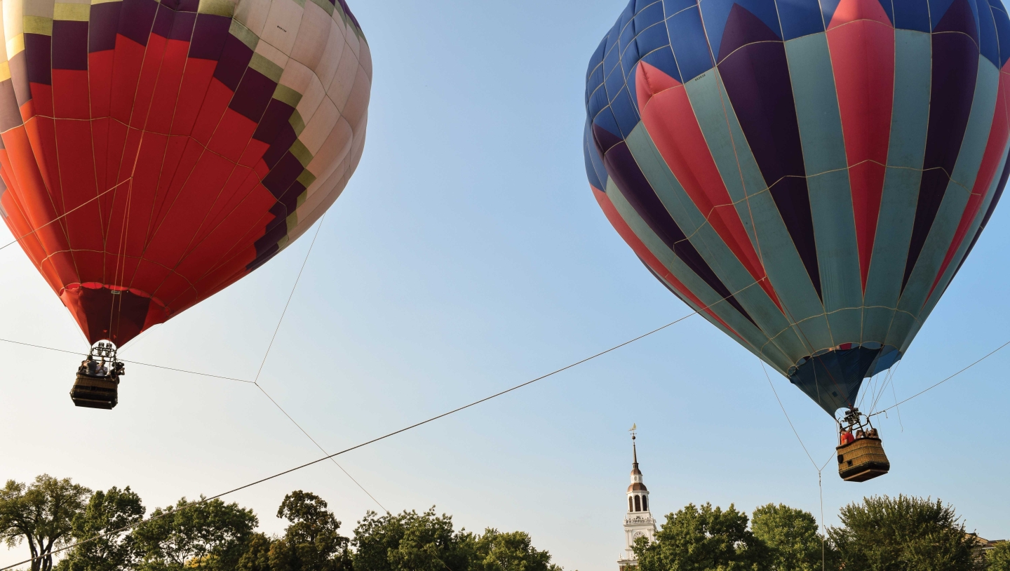 Dartmouth’s living-learning communities (LLCs) hosted free hot air balloon rides on the Green on Saturday, September 16, to raise awareness of their 24 programs. Even though the airships remained tethered and never rose higher than Baker Tower, more than 400 students hopped aboard for an uplifting experience. “The event gave LLCs and other students the chance to come together, make new friends and have fun,” says Jordan Drolet, assistant director of LLCs.