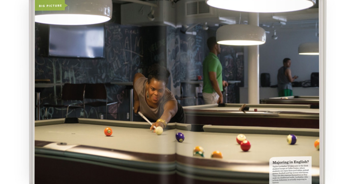 Taylor Luckadue ’15 takes aim in the sleek student lounge at Collis Center, where students can enjoy three pool tables, pinball games, foosball and big-screen televisions. They can also express themselves as they wish via chalkboard walls. Luckadue, who is from Arkansas, is actually majoring in history.