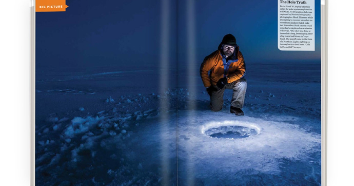 Kevin Hand ’97, deputy chief scientist for solar system exploration at NASA’s Jet Propulsion Lab, was captured by National Geographic photographer Mark Thiessen while attempting to recover an under-ice rover from Alaska’s Sukok Lake last November. Such a rover could someday be deployed on a mission to Europa. “The shot was done at the end of a long, freezing day, after a big storm had blown in,” says Hand. The payoff came in the form of a Northern Lights sighting on the way back to their base. “Cold but beautiful,” he says.