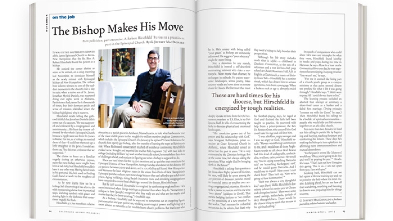 Hirschfeld, 52, has risen from relative obscurity as a parish priest in Amherst, Massachusetts, to hold what has become one of the most visible posts in the roughly 80-million-member Anglican Communion, which includes the Episcopal Church. On January 5 he replaced V. Gene Robinson, the church’s first openly gay bishop, after five months of learning the ropes at Robinson’s side. Where Robinson’s consecration touched off worldwide controversy, Hirschfeld’s evoked none. Straight and married (to teacher Polly Ingraham ’79) with two kids in college (including William ’14) and another in middle school, he nonetheless faces lots of challenges ahead, and not just in figuring out what a bishop is supposed to do.