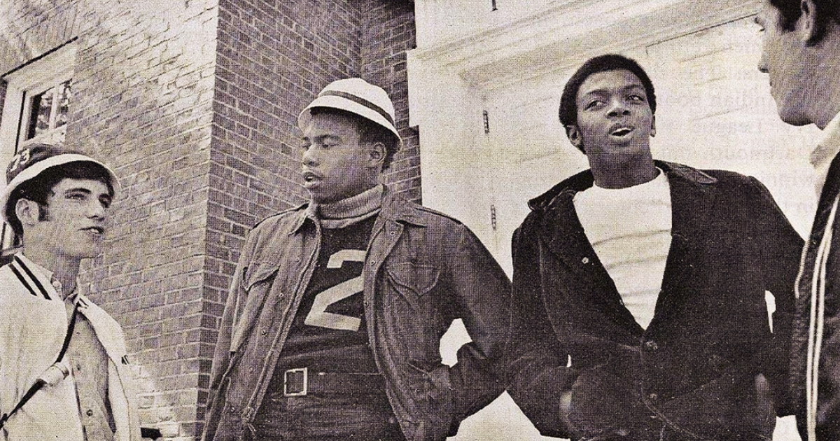 Header image: George C. Riley III ’73 (second from left) and Derek J. Rice ’73 (second from right) speak to classmates in 1969.