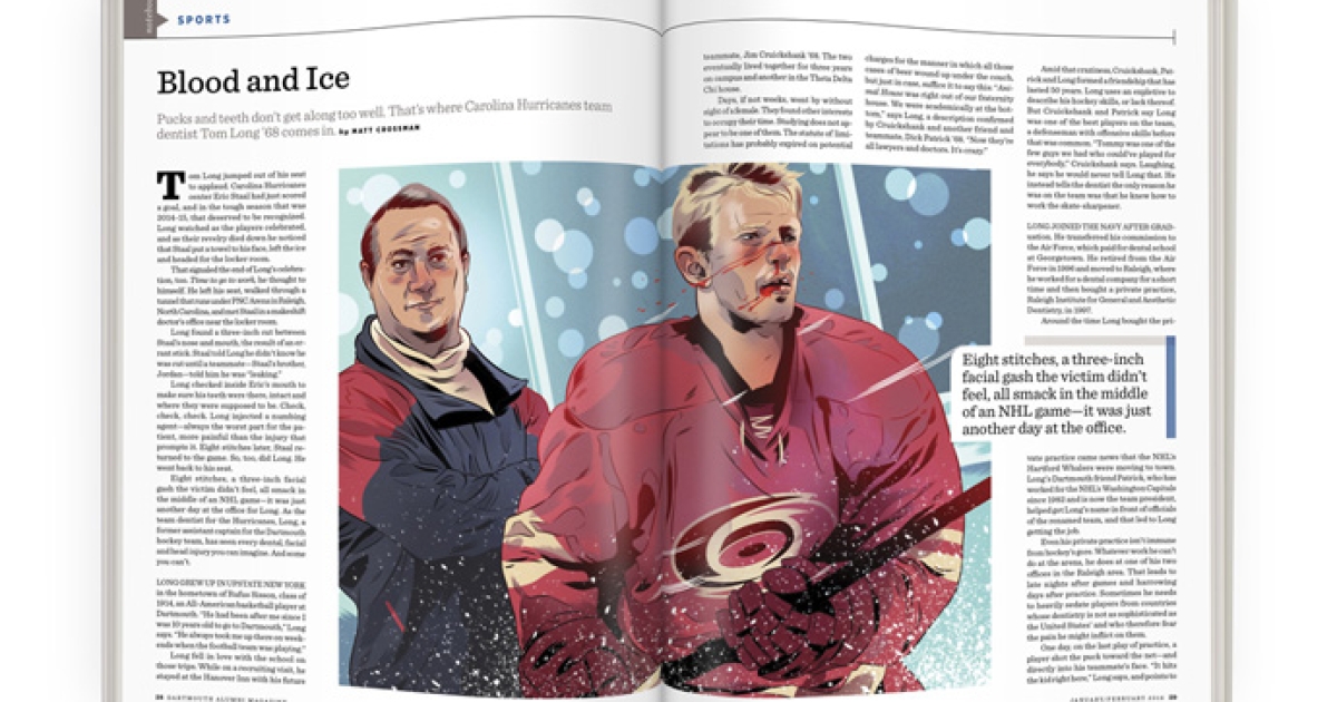 Eight stitches, a three-inch facial gash the victim didn’t feel, all smack in the middle of an NHL game—it was just another day at the office for Long. As the team dentist for the Hurricanes, Long, a former assistant captain for the Dartmouth hockey team, has seen every dental, facial and head injury you can imagine. And some you can’t.
