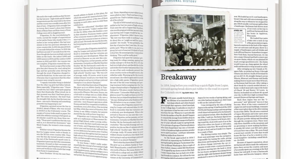 As the break approached in 1954 I planned on repeating my freshman year spring break by skiing in Tuckerman’s Ravine on Mount Washington. But a couple of days before classes ended Bill Buchanan ’56 stopped by my dorm room in Gile Hall. I didn’t know him, but we had a lot of skiing friends in common. He told me he was driving his 1953 Ford station wagon out to Aspen for two weeks of spring skiing, and one rider had just dropped out. Did I want to fill out the carload of four?
