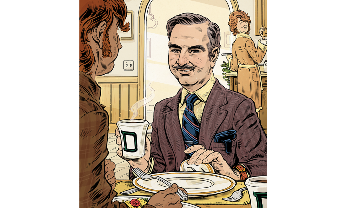 In March of our senior year, Rob invited me over for breakfast prior to driving to Concord, New Hampshire, to watch our high school hockey team compete in the state tournament. Imagine my surprise and delight when John Kemeny, in suit and tie, sat down next to me at the breakfast table. A few minutes later a yawning but ever vivacious Jean Kemeny, in a flowing dressing gown, joined us. I felt a bit like Holly Golightly in the opening scene of the film Breakfast at Tiffany’s who stares into the store’s windows, admiring the shiny objects before her, but that’s where the similarity ended. While Holly nibbled on a croissant and sipped coffee from a paper cup, I chowed down on scrambled eggs and bacon and glugged my coffee from a porcelain Dartmouth cup.