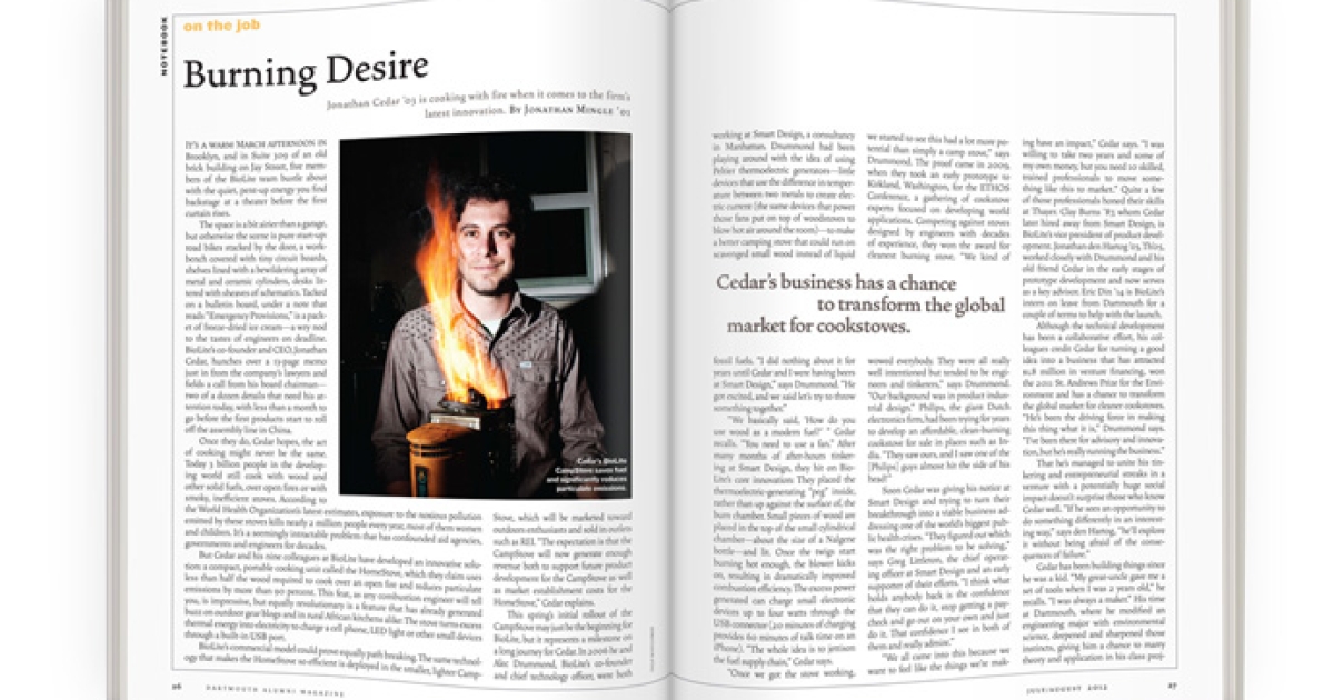 “We all came into this because we want to feel like the things we’re making have an impact,” Cedar says. “I was willing to take two years and some of my own money, but you need 10 skilled, trained professionals to move something like this to market.” Quite a few of those professionals honed their skills at Thayer. Clay Burns ’87, whom Cedar later hired away from Smart Design, is BioLite’s vice president of product development. Jonathan den Hartog ’03, Th’05, worked closely with Drummond and his old friend Cedar in the early stages of prototype development and now serves as a key advisor. Eric Din ’14 is BioLite’s intern on leave from Dartmouth for a couple of terms to help with the launch.