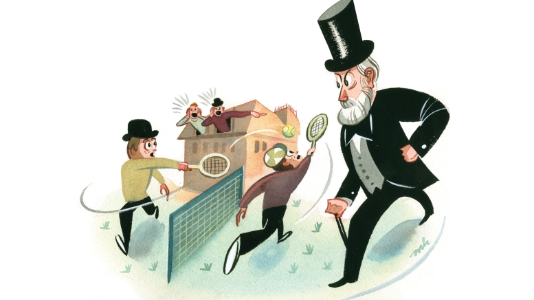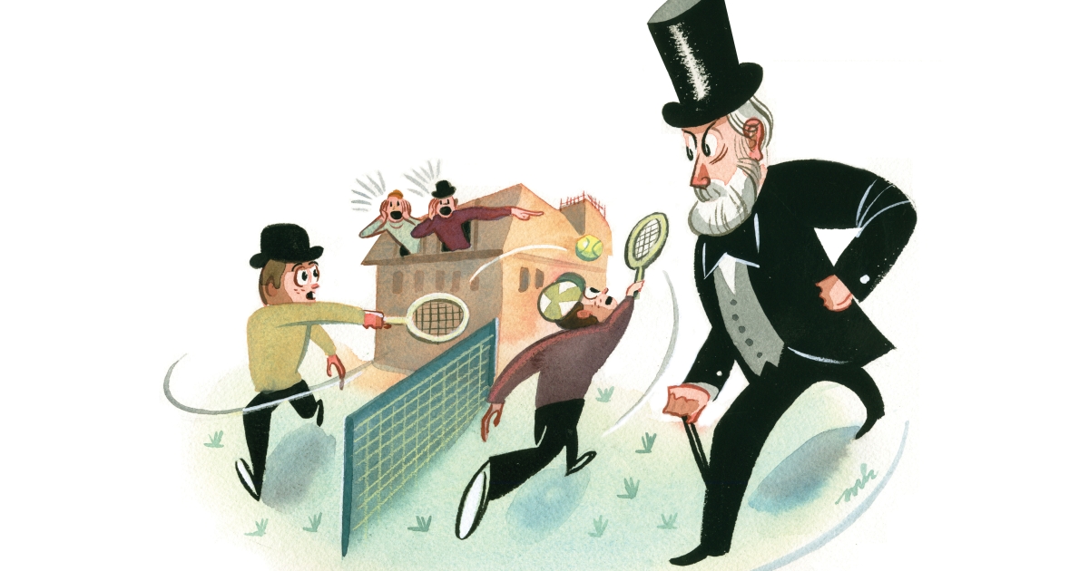 1892—In those days there was a Faculty rule that sports should not be indulged in on the Campus during morning study hours; and while this was observed by the students so far as any large gatherings were concerned, it was the usual procedure for the boys, if they had no morning recitations or studying to do, to play tennis on the few “private courts” that they had laid out around the borders of the Campus, or to play catch, or knock up flys, or kick a football dependent on the seasonal sport.