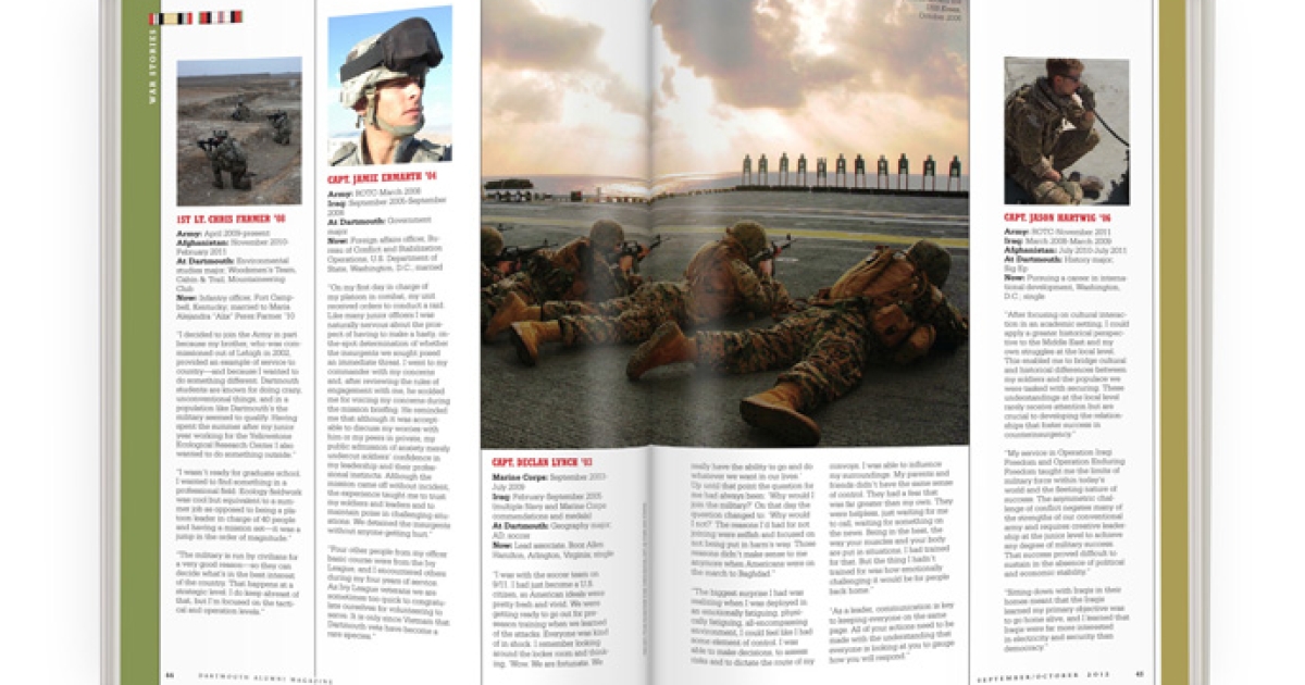 “I decided to join the Army in part because my brother, who was commissioned out of Lehigh in 2002, provided an example of service to country—and because I wanted to do something different. Dartmouth students are known for doing crazy, unconventional things, and in a population like Dartmouth’s the military seemed to qualify. Having spent the summer after my junior year working for the Yellowstone Ecological Research Center I also wanted to do something outside.”
