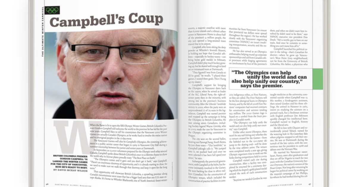 Campbell, who loves skiing the deep powder at Whistler’s Seventh Heaven, is holding out hope that Canada’s athletes—especially its hockey teams—can bring home gold medals in February. Campbell didn’t play much hockey growing up, but he skated well enough to land on an intramural team at Dartmouth.