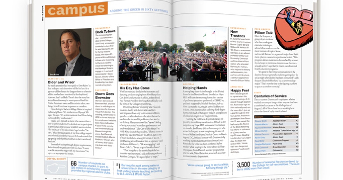 With his extended family in the front rows and featuring speakers ranging from New Hampshire Gov. John Lynch, trustee ex officio, to best friend Paul Farmer, President Jim Yong Kim officially took the reins of the College September 22. Describing Kim as “inspiring” and “focused,” students, faculty and alumni alike said they were impressed not only by the content of Kim’s speech—a call to obtain an education that can be used to solve the world’s problems—but also by his delivery. Many mentioned the “joyous” feeling of a day punctuated by student performances and a solo rendition of “Take Care of This House” by Heidi Kim, sister of the president. “There is so much good will,” said Jim Wooster ’59, Th’60, Tu’60, one of many local alums among the crowd of 5,000. “I liked hearing about President Kim as a person,” said Crishuana Williams ’12. “He was engaging,” said Bianca Cole ’12. “I want to go to his office hours.” “That he spoke to the practicality of the humanities was important,” said art history professor Kathleen Corrigan. “It’s a good place to begin.”