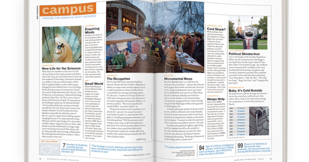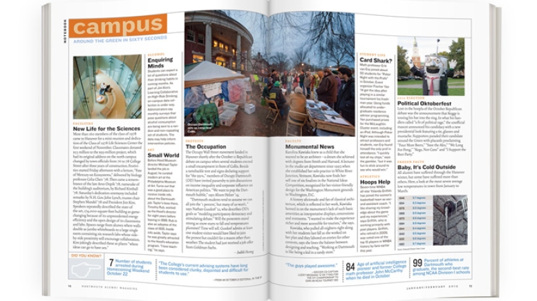 The Occupy Wall Street movement landed in Hanover shortly after the October 11 Republican debate on campus when several students erected a small encampment in front of Collis. Beside a ramshackle tent and signs declaring support for “the 99%,” members of Occupy Dartmouth (OD) have invited passersby to join discussions on income inequality and corporate influence on American politics. “We want to pop the Dartmouth bubble,” says Alison Helzer ’14. “Dartmouth students tend to assume we can all join the ‘1 percent,’ but many of us won’t, ” says Nathan Gusdorf ’12, who describes OD’s goals as “modeling participatory democracy and stimulating debate.” Will the protesters stand strong as snow starts to fall and temperatures plummet? Time will tell. Gusdorf admits at least one student visitor would have liked to join the protest but couldn’t for a reason other than weather: The student had just received a job offer from Goldman Sachs. —Judith Hertog