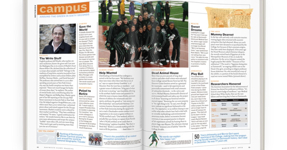 Cheerleading at Dartmouth has undergone a revival in the last four years. “My freshman year there were times when there were five or six of us,” says co-captain Jeremy Guardiola ’12 of Houston. Now the team has 30 members—and a greater sense of athleticism. “A big part of what we do now is stunting,” says Guardiola, referring to the acrobatic basket tosses and pyramids for which the team is known. Joann Brislin, assistant director of athletics for intramurals and club sports, attributes the growth to “very strong student leadership” and coach Josh Hartman. Last summer, however, Hartman accepted a position at New York University, leaving the squad without a coach. Cheerleaders cannot conduct stunting practices or do stunts at games without an NCAA-certified coach. “One weekend, athletics actually flew up a former co-captain from Florida [who is NCAA certified] so we could cheer at Homecoming,” explains Guardiola. “But that’s a Band-Aid.” Brislin is currently working with the team to fill the position. —Sarah Schewe ’12