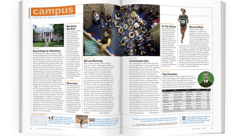In an unexpected move President Barack Obama announced the nomination of Dartmouth President Jim Kim to lead the World Bank. Obama, with Secretary of the Treasury Tim Geithner ’83 on hand, introduced Kim at the White House March 23. “Jim’s personal experience and years of service make him an ideal candidate for the job,” said Obama. Kim is expected to remain Dartmouth’s president until his new appointment begins July 1. Board of Trustees chair Steve Mandel ’78 is spearheading presidential transition plans for the College.