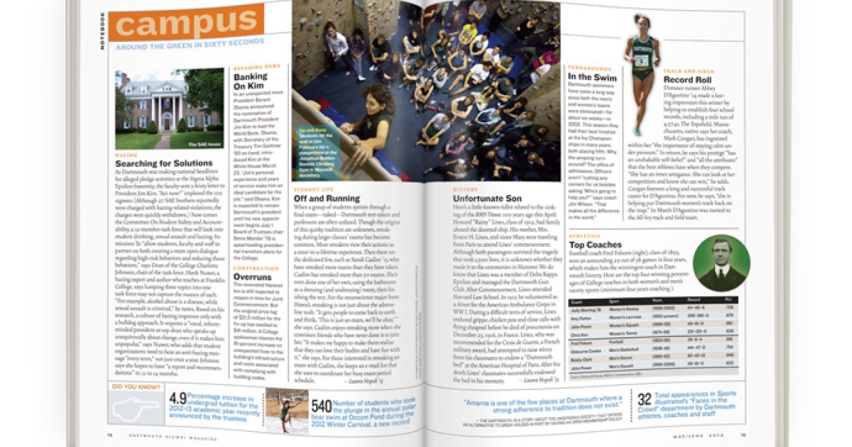 As Dartmouth was making national headlines for alleged pledge activities at the Sigma Alpha Epsilon fraternity, the faculty sent a feisty letter to President Jim Kim. “Act now!” implored the 105 signees. (Although 27 SAE brothers were charged with hazing-related violations, the charges were quickly withdrawn.) Now comes the Committee On Student Safety and Accountability, a 12-member task force that will look into student drinking, sexual assault and hazing. Its mission: To “allow students, faculty and staff to partner on both creating a more open dialogue regarding high-risk behaviors and reducing those behaviors,” says Dean of the College Charlotte Johnson, chair of the task force. Hank Nuwer, a hazing expert and author who teaches at Franklin College, says lumping three topics into one task force may not capture the nuance of each. “For example, alcohol abuse is a disease, while sexual assault is criminal,” he notes. Based on his research, a culture of hazing improves only with a bulldog approach. It requires a “vocal, reform-minded president or top dean who speaks up unequivocally about change, even if it makes him unpopular,” says Nuwer, who adds that student organizations need to hear an anti-hazing message “every term,” not just once a year. Johnson says she hopes to have “a report and recommendations” in 12 to 14 months.