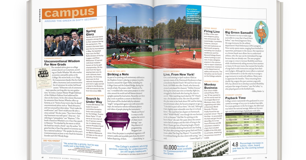 The standard advice given to college seniors doesn’t cut it anymore, according to Charlie Wheelan ’88, who teaches economics and public policy at the College. His recent book, 10 1/2 Things No Commencement Speaker Has Ever Said, offers a humorous and counterintuitive list of utterances he wishes he’d heard sooner. “I’d become sick of commencement speeches not long after my own graduation,” he writes. (Lawyer Marian Wright Edelman of the Children’s Defense Fund addressed his class on the Green.) In his slim volume illustrated by cartoonist Peter Steiner, Wheelan offers up honesty, as in “Some of your worst days lie ahead,” unconventional advice such as “Read obituaries,” and two unusual but direct pleas: “Don’t make the world worse” and “Don’t model your life after a circus animal.” He also notes, “Your time in fraternity basements was well spent.” (Fear not—he’s referring to “camaraderie,” not “libations.”) The book is based on Wheelan’s 2011 Class Day speech in Hanover. “I’m shocked by the extent to which the book has struck a chord,” says the author. “It’s great fun that a Class Day speech in Leverone now has a national audience.” The speaker for this year’s Commencement on June 10 was Teach for America founder and CEO Wendy Kopp.