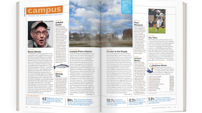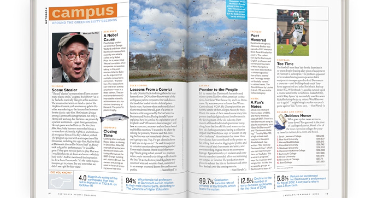 It’s no secret that Dartmouth has embraced winter sports like few other American institutions, but Steve Waterhouse ’65 and Lisa Densmore ’83 want everyone to know that Winter Carnivals and NCAA Ski Championships are not the extent of the College's Passion for Snow. That’s the name of their new documentary film project that highlights alumni involvement in the development of the ski industry. Dartmouth-affiliated individuals pioneered everything from the first ski lifts and resorts to the first ski clothing company, having a collective impact that Waterhouse says is “unseen in any other industry.” He estimates that more than 600 alumni have contributed to the project so far, telling their stories, digging old photos and videos out of their basements and attics, and even recording original music to accompany footage. Approximately 150 students and community members attended a first-cut screening on campus in October. The production team plans to submit the film to Sundance and other film festivals over the coming months. —Svati Narula ’13