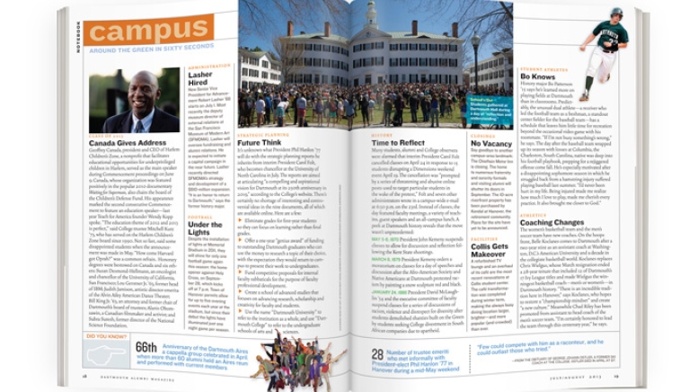 It’s unknown what President Phil Hanlon ’77 will do with the strategic planning reports he inherits from interim President Carol Folt, who becomes chancellor at the University of North Carolina in July. The reports are aimed at articulating “a compelling and aspirational vision for Dartmouth at its 250th anniversary in 2019,” according to the College’s website. There’s certainly no shortage of interesting and controversial ideas in the nine documents, all of which are available online. Here are a few: