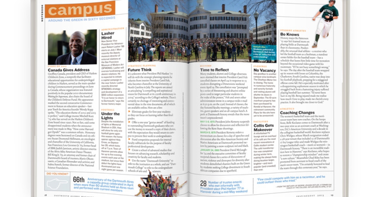 Geoffrey Canada, president and CEO of Harlem Children’s Zone, a nonprofit that facilitates educational opportunities for underprivileged children in Harlem, served as the main speaker during Commencement proceedings on June 9. Canada, whose organization was featured positively in the popular 2010 documentary Waiting for Superman, also chairs the board of the Children’s Defense Fund. His appearance marked the second consecutive Commencement to feature an education speaker—last year Teach for America founder Wendy Kopp spoke. “The education theme of 2012 and 2013 is perfect,” said College trustee Mitchell Kurz ’73, who has served on the Harlem Children’s Zone board since 1990. Not so fast, said some disappointed students when the announcement was made in May. “How come Harvard got Oprah?” was a common refrain. Honorary degrees were bestowed on Canada and six others: Susan Desmond-Hellmann, an oncologist and chancellor of the University of California, San Francisco; Lou Gerstner Jr. ’63, former head of IBM; Judith Jamison, artistic director emerita of the Alvin Ailey American Dance Theater; Bill King Jr. ’63, an attorney and former chair of Dartmouth’s board of trustees; Alanis Obomsawin, a Canadian filmmaker and activist; and Subra Suresh, former director of the National Science Foundation.