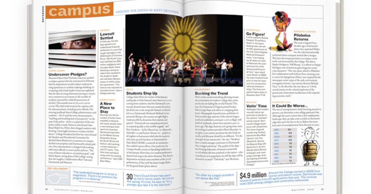 College relief efforts for victims of the January earthquake in Haiti featured more than $200,000 coming from students. And the Dartmouth community donated more than just money. President Jim Kim’s ties to the nonprofit Partners in Health led to 25 Dartmouth-Hitchcock Medical Center personnel flying to the country on eight flights made possible by donations from alumni and parents. “Dartmouth was uniquely positioned to respond quickly to this terrible tragedy,” said Kim. Students—led by Maura Cass ’10, Alexandra Schindler ’10 and Frances Vernon ’10—pulled an all-nighter to brainstorm relief roles for students and came up with Students at Dartmouth for Haiti Relief (SDHR), a network of committees that tackled various efforts. One result was the Compas benefit concert at Spaulding Auditorium in late January. More than 200 student performers danced and sang in the talent showcase. The theater department reunited some members of the 2008 performance of Hair with the dance troupe Sheba for the grand finale.