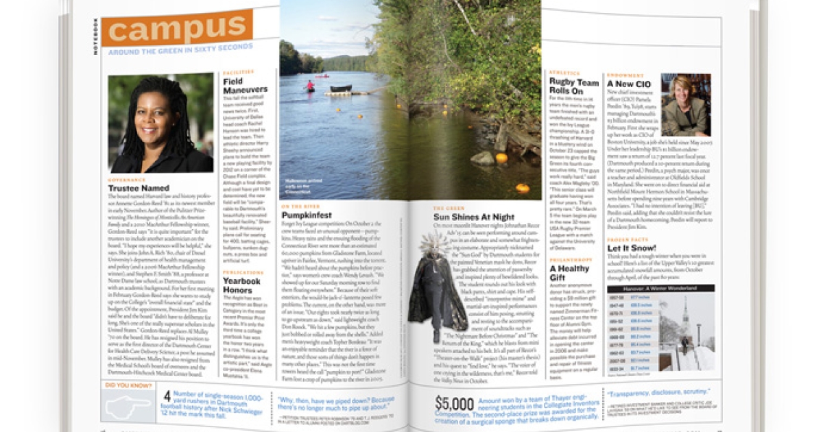Forget Ivy League competition: On October 2 the crew teams faced an unusual opponent—pumpkins. Heavy rains and the ensuing flooding of the Connecticut River sent more than an estimated 60,000 pumpkins from Gladstone Farm, located upriver in Fairlee, Vermont, rushing into the torrent. “We hadn’t heard about the pumpkins before practice,” says women’s crew coach Wendy Levash. “We showed up for our Saturday morning row to find them floating everywhere.” Because of their soft exteriors, the would-be jack-o’-lanterns posed few problems. The current, on the other hand, was more of an issue. “Our eights took nearly twice as long to go upstream as down,” said lightweight coach Don Roock. “We hit a few pumpkins, but they just bobbed or rolled away from the shells.” Added men’s heavyweight coach Topher Bordeau: “It was an enjoyable reminder that the river is a force of nature, and those sorts of things don’t happen in many other places.” This was not the first time rowers heard the call “pumpkin to port!” Gladstone Farm lost a crop of pumpkins to the river in 2005.
