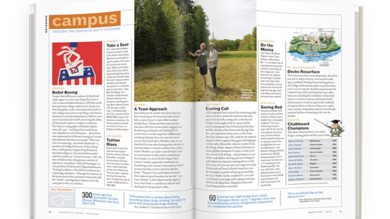The main hall at Baker Library is about to get a bit noisier. And cozier. Workers are transforming the space into more of a study and social area. Sofas and chairs, more electrical outlets, improved lighting and a coffee bar should make the hall “a space where students and faculty can gather in a welcoming environment,” says Ben Schifberg ’13, a member of Dartmouth Student Advisors on Libraries and Computing. Berry News Center will also get a makeover—including high-def TVs—as part of the $400,000 project. Following renovations, the library plans to extend its hours to 2 a.m. on Fridays and Saturdays.