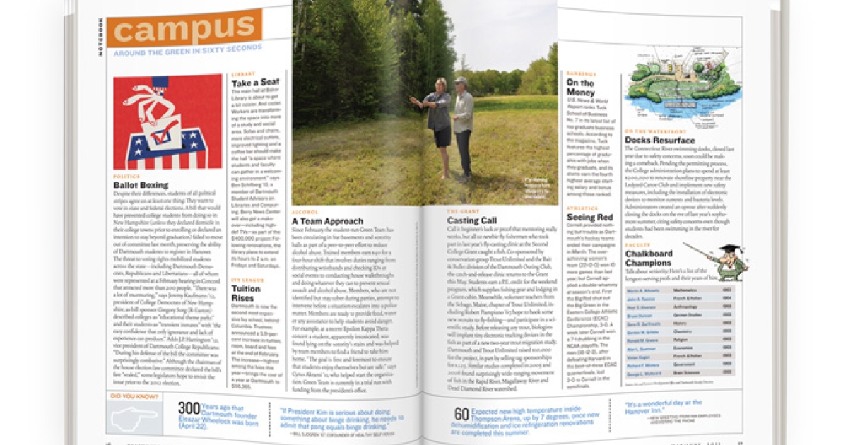 Call it beginner’s luck or proof that mentoring really works, but all 10 newbie fly fishermen who took part in last year’s fly-casting clinic at the Second College Grant caught a fish. Co-sponsored by conservation group Trout Unlimited and the Bait & Bullet division of the Dartmouth Outing Club, the catch-and-release clinic returns to the Grant this May. Students earn a P.E. credit for the weekend program, which supplies fishing gear and lodging in a Grant cabin. Meanwhile, volunteer teachers from the Sebago, Maine, chapter of Trout Unlimited, including Robert Piampiano ’67, hope to hook some new recruits to fly-fishing—and participate in a scientific study. Before releasing any trout, biologists will implant tiny electronic tracking devices in the fish as part of a new two-year trout migration study. Dartmouth and Trout Unlimited raised $10,000 for the project, in part by selling tag sponsorships for $225. Similar studies completed in 2005 and 2008 found surprisingly wide-ranging movement of fish in the Rapid River, Magallaway River and Dead Diamond River watershed.
