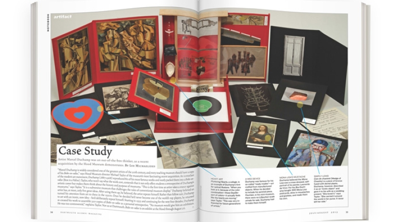 “Marcel Duchamp is widely considered one of the greatest artists of the 20th century, and every teaching museum should have a copy of his Boîte-en-valise,” says Hood Museum director Michael Taylor of the museum’s most fascinating recent acquisition. An iconoclast of the modern art movement, Duchamp (1887-1968) reproduced 80 of his most famous works and neatly packed them into a Boîte-en-valise (Box in a Valise). Taylor, who won’t say what the work cost, contends that it not only offers students a retrospective of Duchamp’s artistic career but makes them think about the history and purpose of museums. “This is the first time an artist takes a stance against museums,” says Taylor. “It is a subversive museum that challenges the rules of conventional museum display.” Duchamp believed an artist has, at most, only five great ideas. After using them up, he believed, the artist repeats himself. Rather than follow suit, Duchamp turned his attention from art to chess in the 1920s. Once he decided he’d never become one of the world’s top players, he returned to art with an ironic, new idea—he’d deliberately repeat himself. Starting in 1935 and continuing for the next four decades, Duchamp re-created his work to assemble 320 copies of Boîte-en-valise as a personal retrospective. “No museum would give him an exhibition. He was too controversial,” explains Taylor. Not so at Dartmouth. Boîte-en-valise is on exhibit at the Hood through August 26.