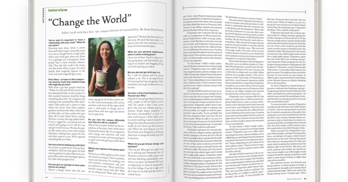 I love my job. What gets me really fired up is realizing that Dartmouth has all the pieces to lead in a really unique way and start delivering sustainability solutions to our peers and beyond. We have an opportunity to invest in sustainability at the College. If we do it right, and do it now, we can help lead the world to a better future.
