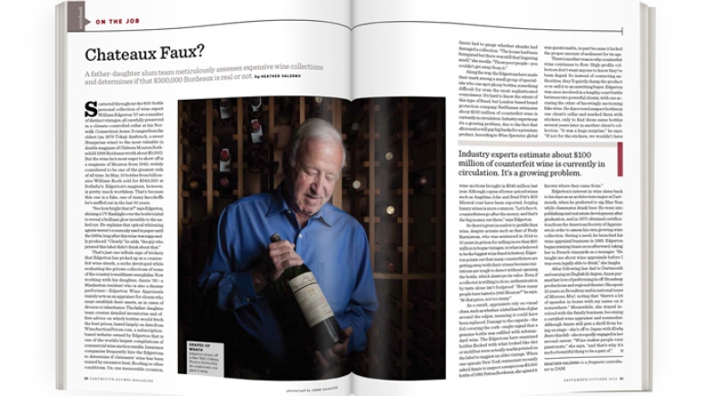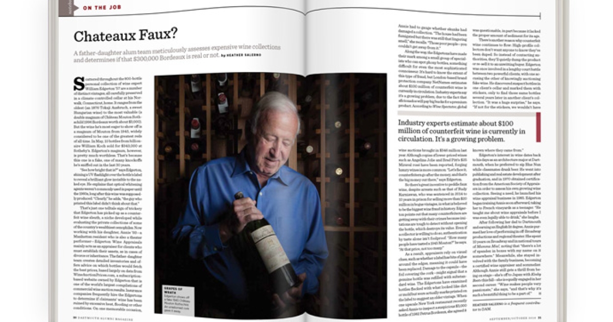 That’s just one telltale sign of trickery that Edgerton has picked up as a counterfeit wine sleuth, a niche developed while evaluating the private collections of some of the country’s wealthiest oenophiles. Now working with his daughter, Annie ’93—a Manhattan resident who is also a theater performer—Edgerton Wine Appraisals mainly acts as an appraiser for clients who must establish their assets, as in cases of divorce or inheritance. The father-daughter team creates detailed inventories and offers advice on which bottles would fetch the best prices, based largely on data from WineAuctionPrices.com, a subscription-based website owned by Edgerton that is one of the world’s largest compilations of commercial wine auction results. Insurance companies frequently hire the Edgertons to determine if claimants’ wine has been ruined by excessive heat, flooding or other conditions. On one memorable occasion, Annie had to gauge whether skunks had damaged a collection. “The house had been fumigated but there was still that lingering smell,” she recalls. “Those poor people—you couldn’t get away from it.”