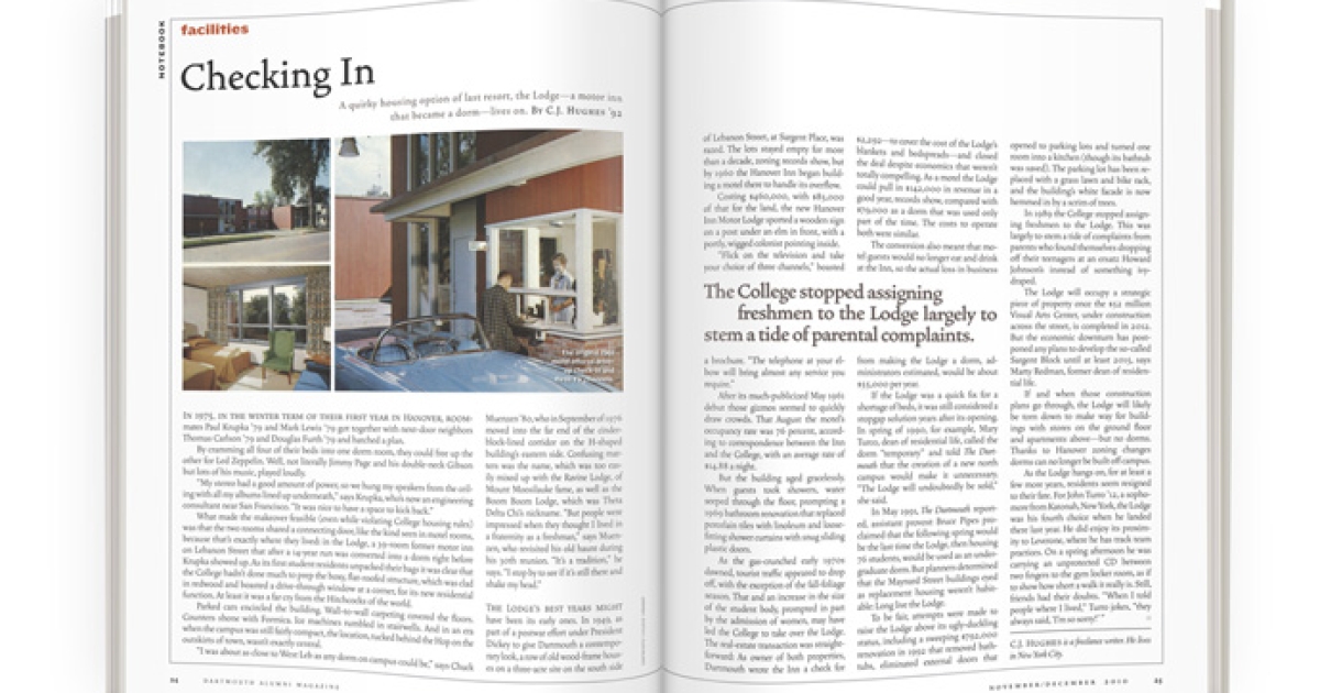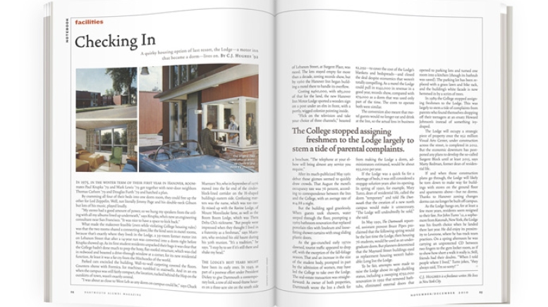 As the gas-crunched early 1970s dawned, tourist traffic appeared to drop off, with the exception of the fall-foliage season. That and an increase in the size of the student body, prompted in part by the admission of women, may have led the College to take over the Lodge. The real-estate transaction was straightforward: As owner of both properties, Dartmouth wrote the Inn a check for $2,292—to cover the cost of the Lodge’s blankets and bedspreads—and closed the deal despite economics that weren’t totally compelling. As a motel the Lodge could pull in $142,000 in revenue in a good year, records show, compared with $79,000 as a dorm that was used only part of the time. The costs to operate both were similar.