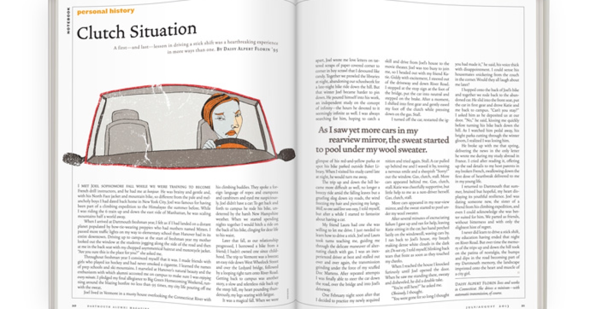 I never did learn to drive a stick shift, my education having ended that night on River Road. But over time the memory of the trips up and down the hill took on the patina of nostalgia, the bumps and dips in the road becoming part of my Dartmouth memory, the landscape imprinted onto the heart and muscle of a city girl.