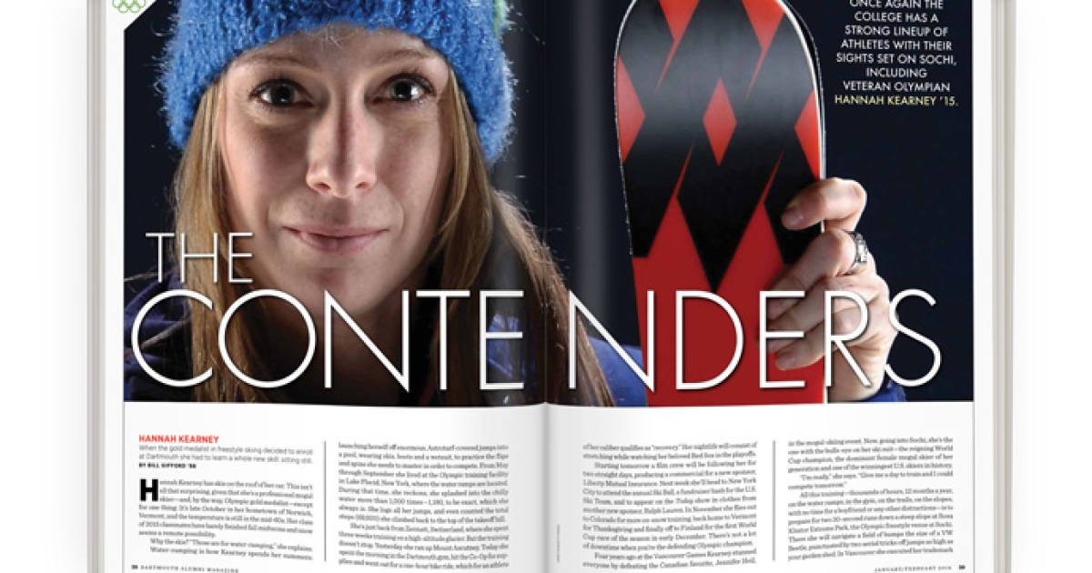 Hannah Kearney has skis on the roof of her car. This isn’t all that surprising, given that she’s a professional mogul skier—and, by the way, Olympic gold medalist—except for one thing: It’s late October in her hometown of Norwich, Vermont, and the temperature is still in the mid-60s. Her class of 2015 classmates have barely finished fall midterms and snow seems a remote possibility.