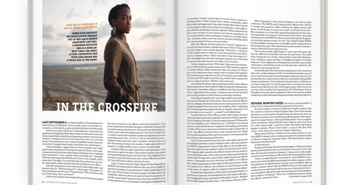 Later, I learned that the Santa Monica Police Department (SMPD) had dispatched 19 officers after one of my neighbors reported a burglary at my apartment. It didn’t matter that I told the cops I’d lived there for seven months, told them about the locksmith, offered to show a receipt for his services and my ID. It didn’t matter that I’d gone to Duke, that I have an M.B.A. from Dartmouth, that I’m a vice president of strategy at a multinational corporation. It didn’t matter that I’ve never had so much as a speeding ticket. It didn’t matter that I calmly, continually, asked them what was happening. It also didn’t matter that I didn’t match the description of the person they were looking for—my neighbor described me as Hispanic when he called 911. What mattered was that I was a woman of color trying to get into her apartment—in an almost entirely white apartment complex in a mostly white city—and that a white man who lived in another building called the cops because he’d never seen me before.