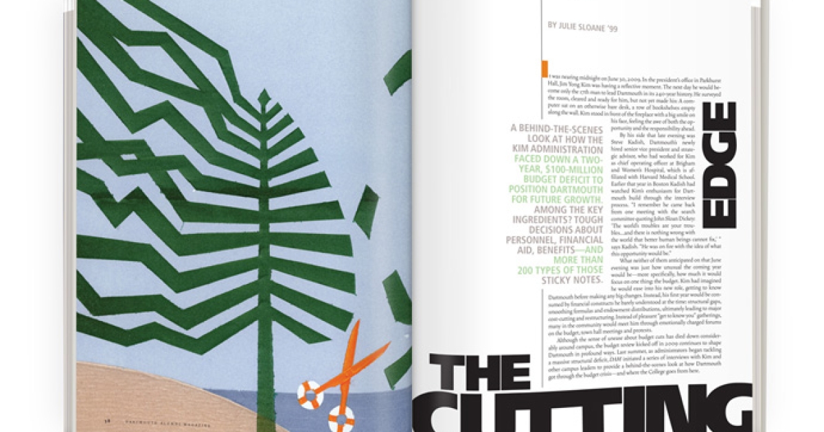 Although the sense of unease about budget cuts has died down considerably around campus, the budget review kicked off in 2009 continues to shape Dartmouth in profound ways. Last summer, as administrators began tackling a massive structural deficit, DAM initiated a series of interviews with Kim and other campus leaders to provide a behind-the-scenes look at how Dartmouth got through the budget crisis—and where the College goes from here.