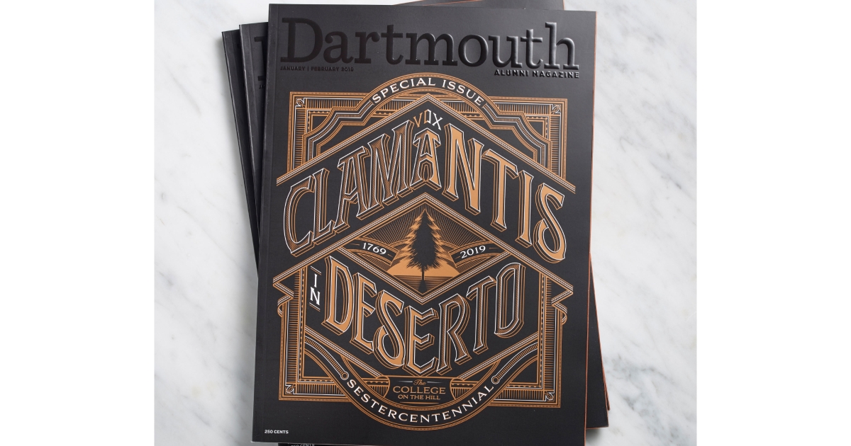 The January/February 2019 issue of DAM, which celebrated Dartmouth’s 250th anniversary, won a Silver Award for magazine design and a Silver Award for special issues. “The magazine achieved impact for a celebration issue,” the judges said of the sestercentennial special—they were “impressed by the quantity of content and huge efforts to source historical content and mix with brand new celebratory content—complete with a letter archive and beautiful pull-out posters.” The special issue received additional praise from PRINT magazine, which included the issue in its Best of the East 2019 Awards.